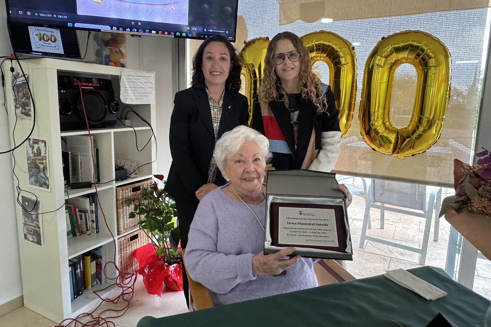 Durant l’acte, se li ha fet entrega d’una placa commemorativa i un ram de flors en reconeixement a aquest aniversari tan especial. La Teresa, nascuda l’11 d’abril de 1926 a Igualada, va viure durant anys amb la seva filla i el seu gendre a Llavaneres, i des del 2023 resideix a Sant Vicenç de Montalt.