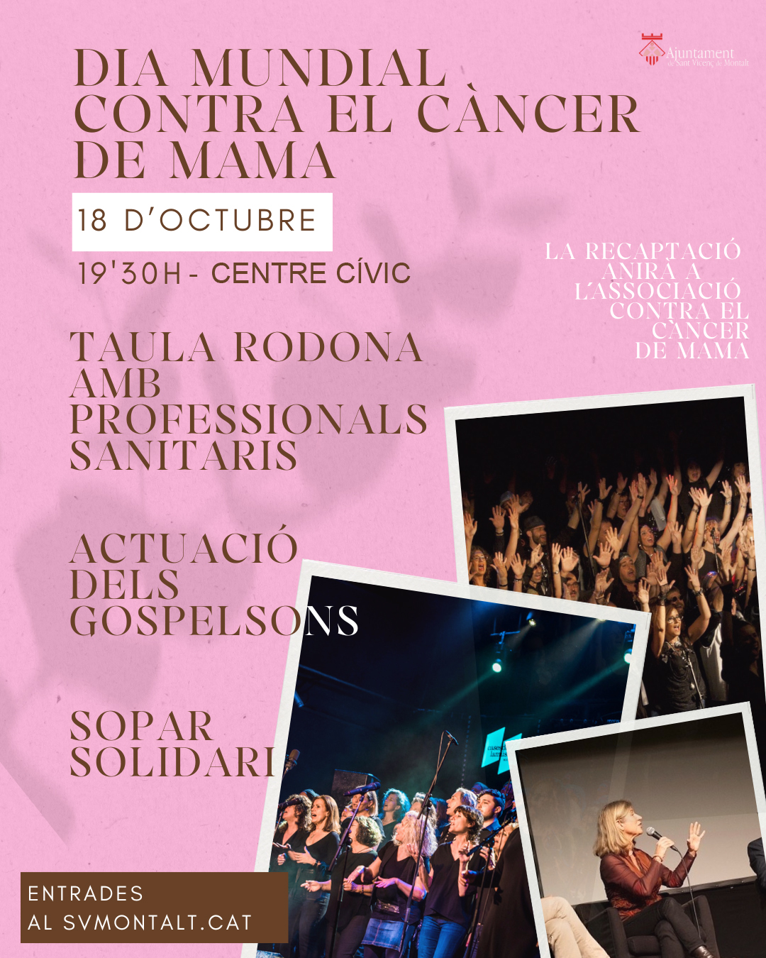 La celebració del Dia Internacional del Càncer de Mama, el 19 d’octubre, tindrà el seu reflex a Sant Vicenç de Montalt. Serà mitjançant diferents gestos i activitats que tenen com a objectiu global informar i sensibilitzar la ciutadania i conscienciar sobre la importància del diagnòstic precoç per guanyar la lluita contra aquesta malaltia que, anualment, afecta més de 5.400 dones a Catalunya.