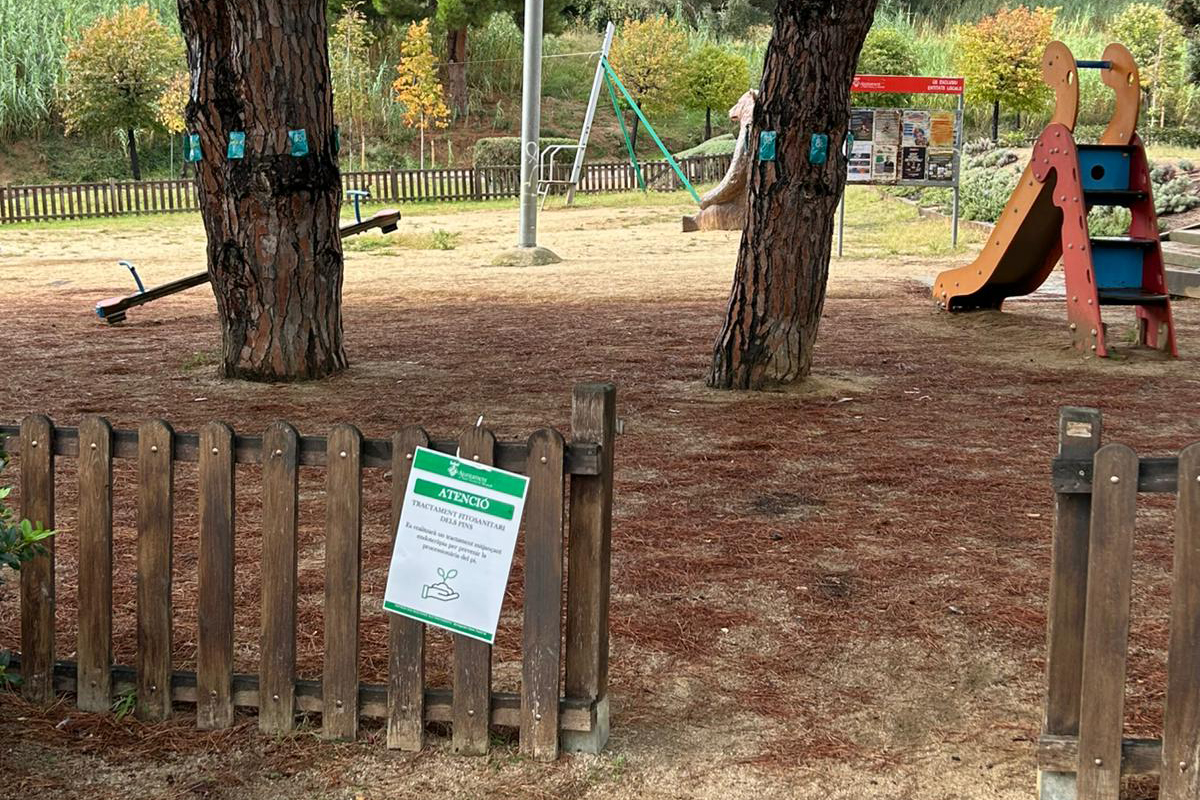 El tractament es va efectuar ahir dilluns i té una durada de 24 hores, de tal forma que aquest dimarts es retiraran les bosses d’aquesta eruga que provoca la defoliació dels pins i que pot resultar perillosa tant per les persones com per les mascotes, ja que pot provocar inflamació, picor, asma i, en els casos més greus, possibles reaccions anafilàctiques. És per això que és molt important no tocar-les. Són molt vistoses perquè acostumen a moure’s en filera; motiu pel qual rep el nom de processionària del pi.