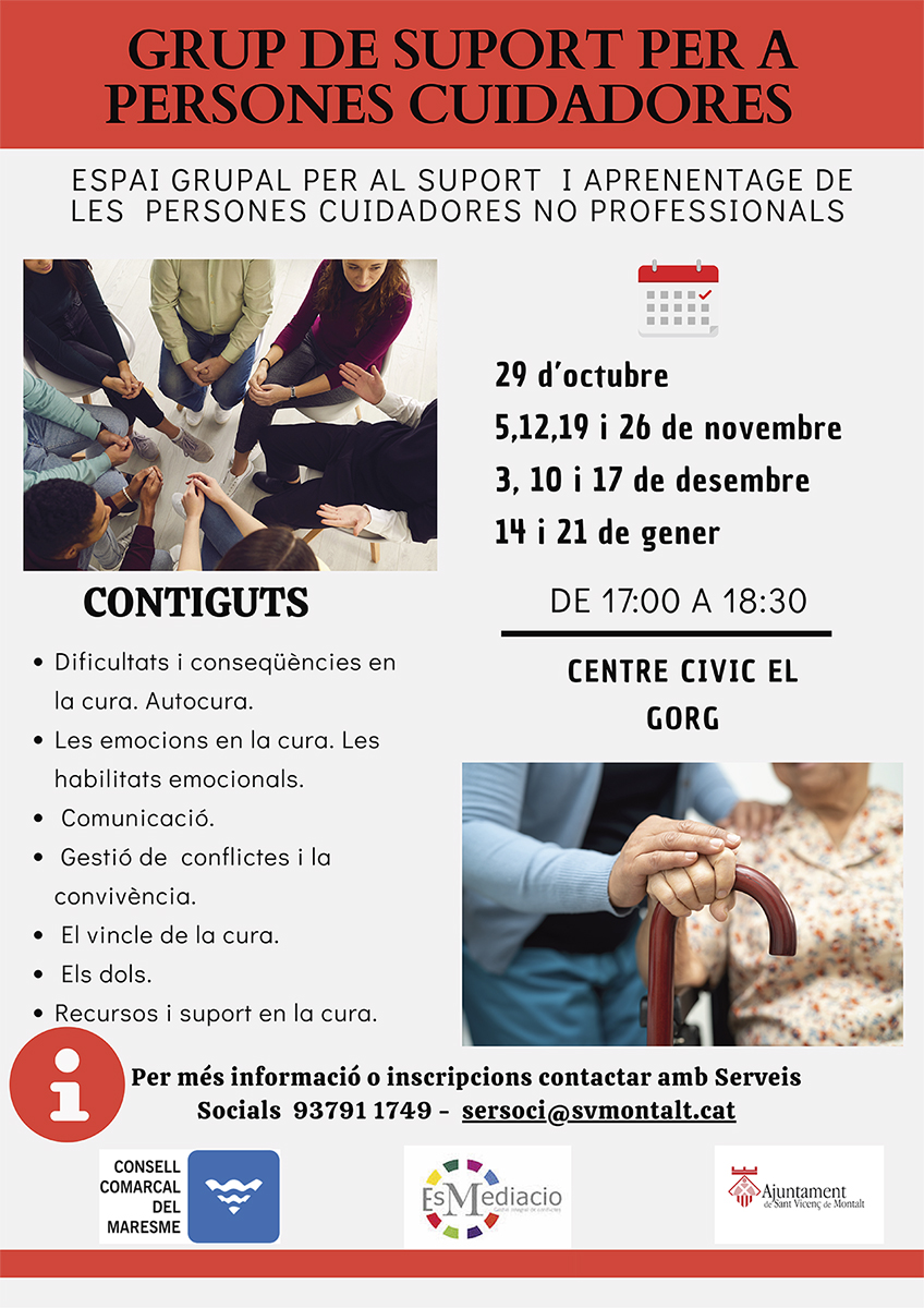 Aquest mes d'octubre s'han posat en marxa dos Grups de Suport i Ajuda Mútua (GSAM). Aquest recurs, impulsat per l'Ajuntament i la Diputació, està adreçat a cuidadors i cuidadores no professionals de persones que es troben en situació de dependència. El primer va començar el passat 6 d’octubre al Centre Cívic El Gorg i el segon aquest dimecres, 29 d'octubre.