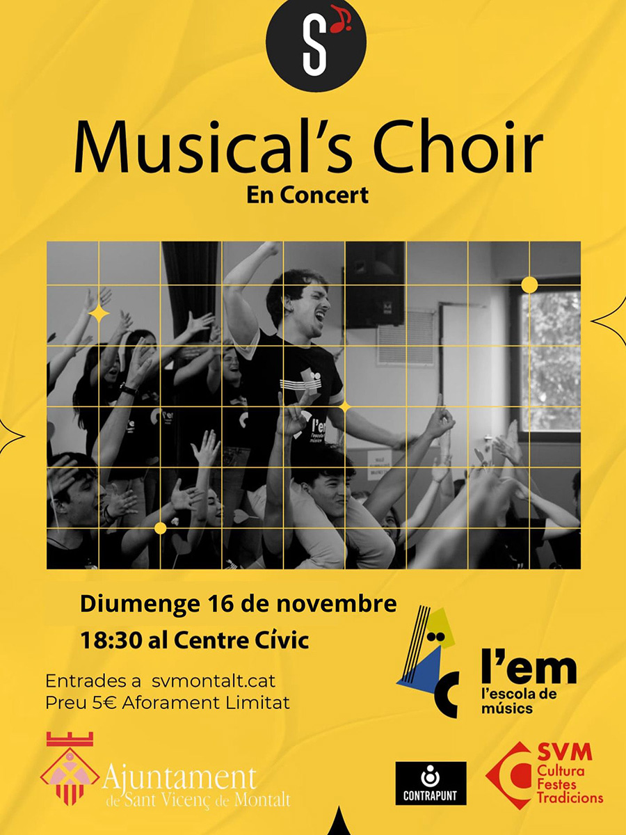 Format per 63 nois i noies del barri de Ciutat Vella, a Barcelona, aquest cor va néixer al febrer de 2014 i des d’aleshores s’ha consolidat com una de les formacions juvenils amb més projecció. Especialitzat en repertori de musicals, Musical’s Choir destaca per la seva frescor, intensitat i alegria sobre l’escenari. Cada actuació és una explosió d’energia i emoció, en què els joves intèrprets comparteixen amb el públic el seu món interior i la seva passió per la música.