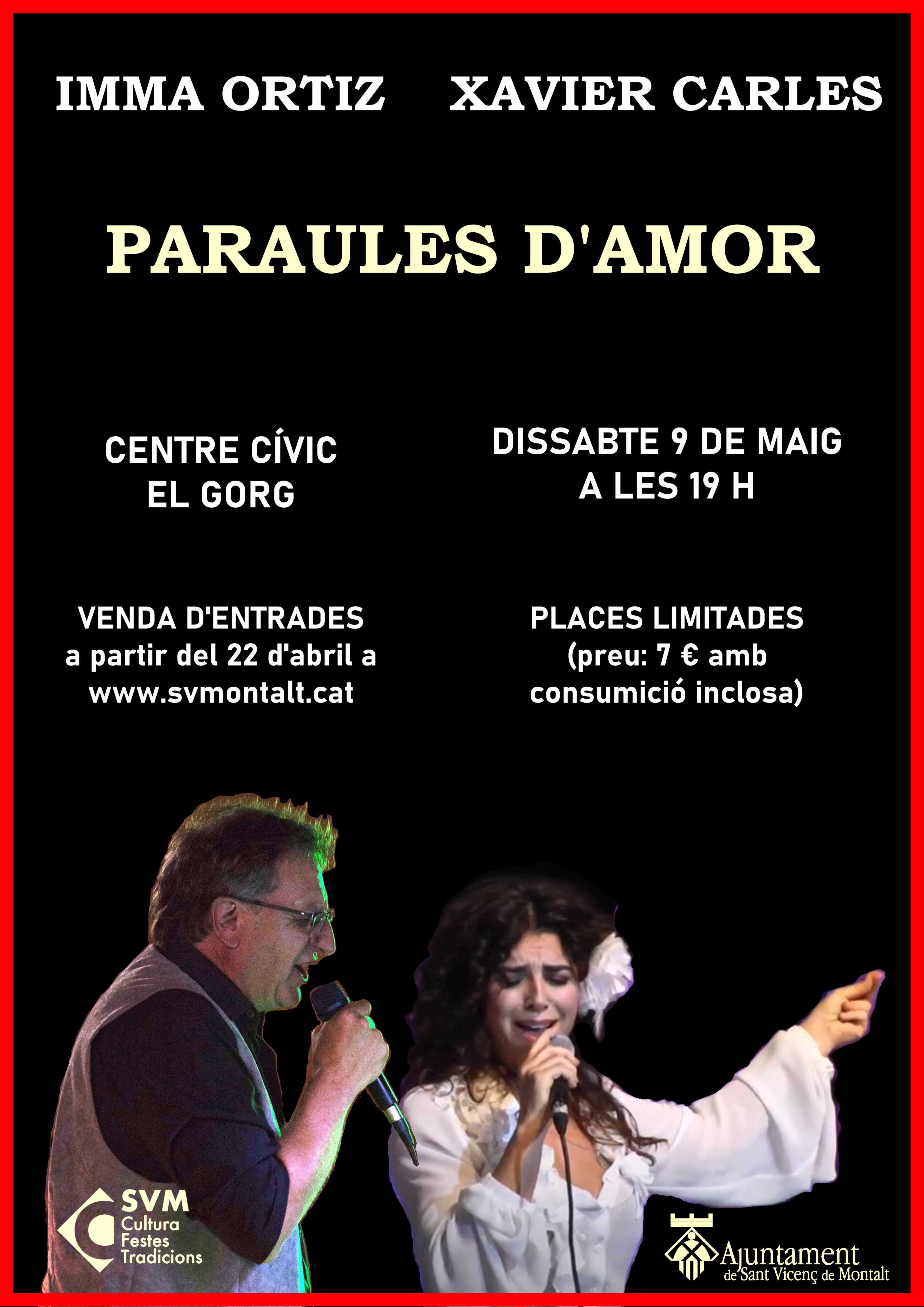 Xavier Carles i Imma Ortiz uneixen els seus talents per a oferir-nos un espectacle de cançó en què la bellesa de les paraules és protagonista. Emoció i sensualitat a la carta.